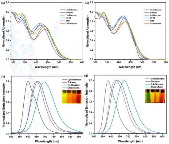 The UV-vis absorption and fluorescent emission spectra of DCFOPV-TPA and SCFOPV-TPA in various solvents were initially investigated (Figure 1), and the key photophysical parameters are summarized in Table S1. Due to the inclusion of the electron-donating TPA group and electron-withdrawing cyano moiety, both DCFOPV-TPA and SCFOPV-TPA are donor–acceptor (D-A)-type molecules, which exhibit a typical ICT process. As expected, both compounds exhibited two intense absorption bands in the 280–550 nm region (Figure 1a,b). The absorption peaks located at around 335 nm originated from the π–π* transition, while the absorption bands ranging from 380 nm to 550 nm can be ascribed to the ICT transition from the electron-rich TPA segment to the electron-deficient cyano-substituted vinylbenzene moiety. With the increasing solvent polarity, both DCFOPV-TPA and SCFOPV-TPA exhibit similar absorption profiles with very slightly blue-shifted phenomena, suggesting little difference in the dipole moment in the ground state. For example, in the nonpolar solvents cyclohexane and toluene, the ICT band of DCFOPV-TPA is located at 436 nm and 438 nm, which is blue-shifted to 431 nm, 423 nm, 415 nm, and 419 nm in the polar solvents CHCl3, DCM, THF, and 1,4-dioxane. It could be that larger dihedral angles in more polar solvents lead to a lower degree of conjugation, which further causes the absorption peak to be blue-shifted [66,67]. To support this hypothesis, density functional theory (DFT) calculations were performed for DCFOPV-TPA (Table S2). Clearly, the dihedral angles of DCFOPV-TPA in the CHCl3, DCM, and THF solvents are larger compared with those in cyclohexane and toluene, which, consequently, leads to the blue-shifted simulated UV-vis absorption peaks.