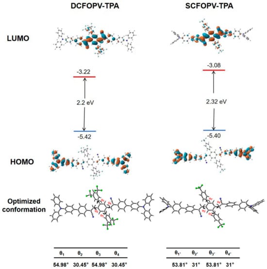 Illustration of spatial electron distribution of HOMOs and LUMOs and optimized molecular geometry of DCFOPV-TPA and SCFOPV-TPA. The DFT calculations were carried out using the Gaussian 16 program at the B3LYP/6-311++G(d, p) level of theory.