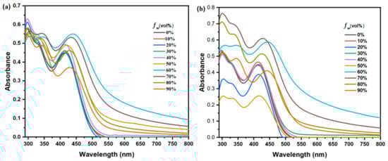 UV–vis absorption spectra of DCFOPV-TPA (a) and SCFOPV-TPA (b) in THF/water mixtures with different fw.