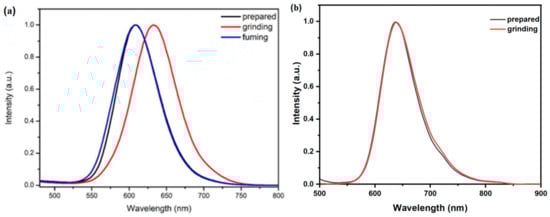 (a) Normalized fluorescent spectra of DCFOPV-TPA (a) and SCFOPV-TPA (b) in the following different solid states: as-prepared, grinding, and fuming (λex = 425 nm).