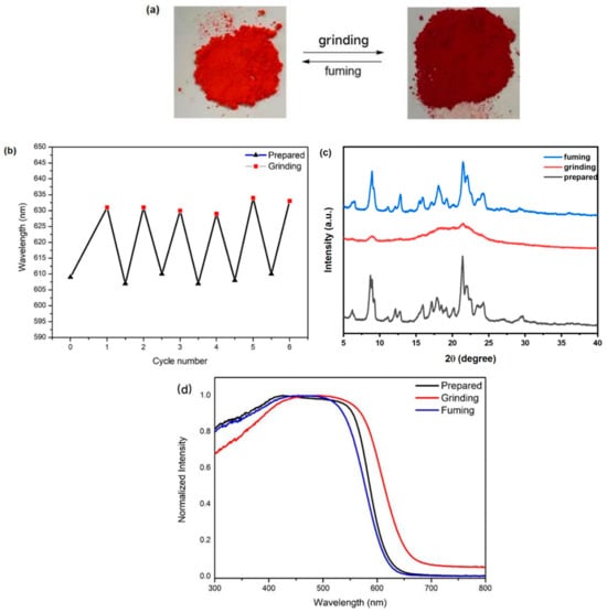 (a) Photographs of DCFOPV-TPA color changes under grinding and fuming stimuli. (b) Cyclic diagram of stimulus–response performance of DCFOPV-TPA. (c) PXRD patterns of DCFOPV-TPA in the following different solid states: as-prepared, grinding, and fuming. (d) Normalized UV-vis spectra of DCFOPV-TPA in different states.