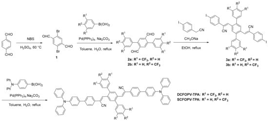 The synthetic procedure for DCFOPV-TPA and SCFOPV-TPA is described in Scheme 2. Compound 1 was prepared via an electrophilic substitution reaction with NBS according to the previous literature [65]. A subsequent Suzuki–Miyaura cross-coupling reaction between aldehyde 1 and trifluoromethyl-substituted phenyl boronic acids was performed to give the corresponding products 2a and 2b 80% and 83% yields, respectively. Next, Knoevenagel condensation between 2 and 2-(4-iodophenyl) acetonitrile using MeONa as the base generated the corresponding products 3a and 3b in an up to 85% yield. Finally, the target compounds, DCFOPV-TPA and SCFOPV-TPA, were obtained via a Pd-catalyzed Suzuki–Miyaura cross-coupling reaction in 78% and 79% yields, respectively. All the new compounds were fully characterized by 1H NMR, 13C NMR, and HRMS analysis (Figures S1–S13).