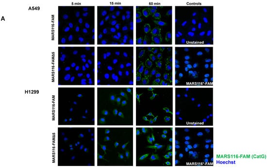 Catalytically active CatG and NE bind to the cell surface of A549 and H1299 cells and are internalized. (A) Confocal microscopy images illustrate A549 and H1299 cells incubated with CatG [10 µg/mL] complexed with MARS116-FAM or MARS116-FAMΔ5 [0.5 µM] at various time points (5, 10, and 60 min) at RT. The data presented are representative of three independent experiments (n = 3). (B) CatG [10 µg/mL] was preincubated with the CatG inhibitor (10, 25, and 50 µM), followed by adding MARS116-FAM [0.5 µM]. Catalytically active CatG was determined in H1299 cells by confocal microscopy; n = 3. (C) A549 cells were incubated with NE [10 µg/mL] complexed with VPV-FAM [10 µM]. The data represent findings from two separate, independent experiments.