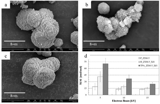 SEM images of samples (a) P_ZSM-5; (b) H_ZSM-5_Sil1; (c) TPA_ZSM-5_Sil1, and (d) Si/Al ratio of the samples measured by EDX at different electron beam voltages.