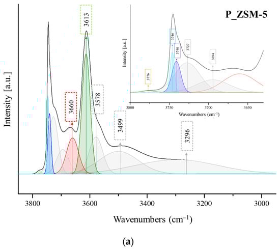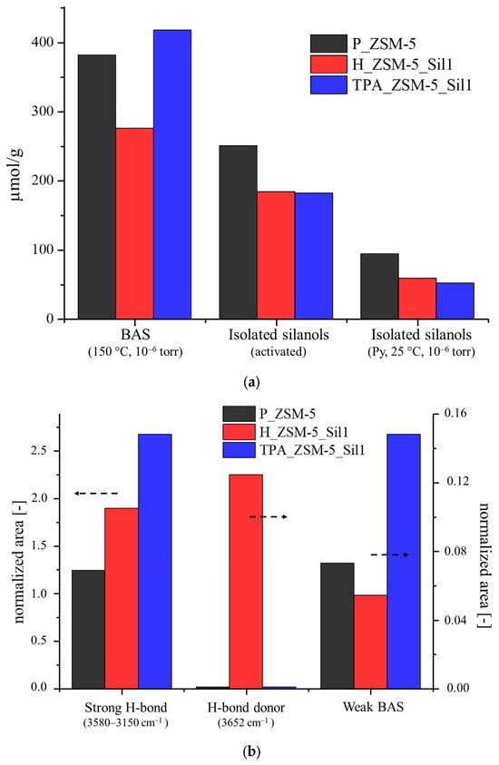 Aside from the presence of Brønsted and Lewis sites in the samples, the silanols present were sufficiently acidic and may interact with the basic probe at room temperature. Among these silanol species, the free silanols were similar for the three samples, while the contribution of the terminal H-bonded species responsible of the band at 3727 cm−1 seemed to be different (Table 2 and Figure 6). This contribution is related to the weak BAS, and in the TPA_ZSM-5_Sil1 composite, they were more than two times higher than in the parent P_ZSM-5 sample, and three times more than in the H_ZSM-5_Sil1 composite. Further deconvoluting the peak at 3660 cm−1 for the H_ZSM-5_Sil1 composite clearly showed that there was an overlap of two or more functions (Figure 6b). There was a contribution from the presence of extra framework aluminum, but also a second band located at 3651 cm−1, which was tentatively attributed to H-bond donors in the vicinal position. This band was completely absent in both the P_ZSM-5 and in the TPA_ZSM-5_Sil1 samples.
