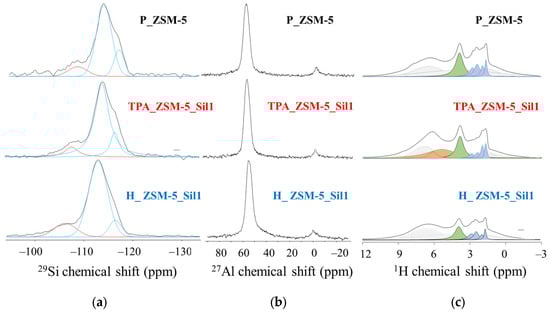 The 29Si NMR spectra of the three samples are depicted in Figure 3a. The parent sample P_ZSM-5 and the TPA_ZSM-5_Sil1 composite kept a similar overall local order while a slight broadening in the Q4(0Al) region (below −110 ppm) was observed for the H_ZSM-5_Sil1 composite (Figure 3a). The Q4(1Al) sites (−105 ppm) were assigned to Si-O-Al linkages [25]. The 27Al NMR spectra showed the same trend (Figure 3b): a broadening in the peak corresponding to tetrahedral Al sites was observed for the H_ZSM-5_Sil1 composite, while both the P_ZSM-5 and TPA_ZSM-5_Sil1 samples presented a similar trend; a small amount of extra-framework Al was present in all samples [3]. To further understand the local order, high resolution 1H NMR spectra were acquired and are shown in Figure 3c. The intensity of the peak at 3.7 ppm, assigned to isolated BAS, decreased by 40% for the H_ZSM-5_Sil1 composite compared to the P_ZSM-5 parent sample, while it only decreased by 4% for the TPA_ZSM-5_Sil1 composite. In addition, broad bands appeared at high chemical shifts above 5.8 ppm in the spectrum of sample TPA_ZSM-5_Sil1, which were assigned to H bonded silanols/BAS [26,27].
