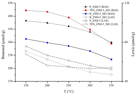 The linear relationship between absorbance (peak area) and the molar amounts of Py for the three samples was similar to those reported earlier [36]. This may suggest no diffusivity problem in the samples, and consequently, no problem of blocking of the pores, as already demonstrated by the N2 adsorption analyses. A slight increase in the amount of BAS for the TPA_ZSM-5_Sil1 composite and a 21% decrease with respect to that of the H_ZSM-5_Sil1 composite were observed, while no significant variation of LAS was measured. This suggests that the crystallization of Silicalite-1 did not lead to an increase in the extra framework Al and that the increase in the peak at 3660 cm−1 for the H_ZSM-5_Sil1 composite was due to the increase in some silanol interactions. Furthermore, to evaluate any differences in terms of strength of the acid sites, a desorption study of Py was performed at controlled temperatures and pressures (150–350 °C, 10−6 torr). The fast decrease in the area of the bands at 1597 and 1446 cm−1 due to H-bonded Py was observed (Figure 4), while pyridinium tended to be quite stable even at high temperatures. The zones corresponding to the absorption of the PyH+ cation measured at 300 °C varied only by 22.3, 21.4, and 17.5% for the samples P_ZSM-5, H_ZSM-5_Sil1, and TPA_ZSM-5_Sil1, respectively, compared to the values measured at 150 °C.