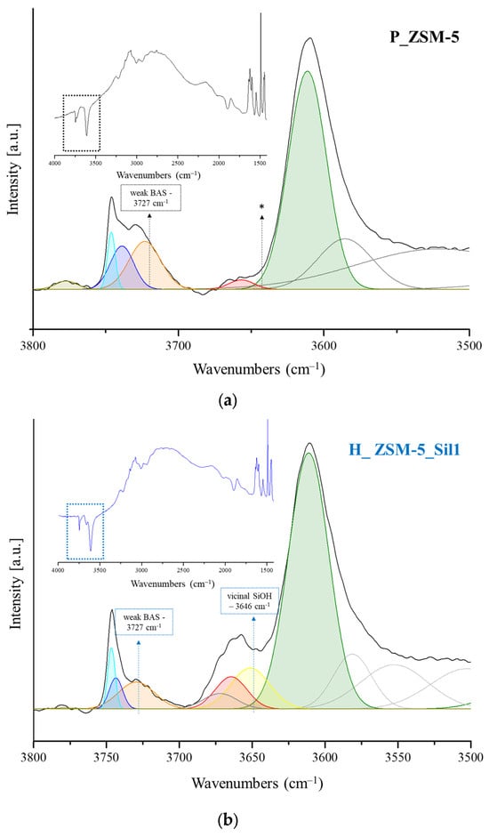 Deconvolution of the FTIR spectra on the OH bands (3800–3500 cm−1) of the sample spectra of samples P_ZSM-5 (a), H_ZSM-5_Sil1 (b), and TPA_ZSM-5_Sil1 (c). Spectra represent the differences of the area of the spectra acquired after the adsorption of Py (25 °C, 10−6 torr) and the one acquired after the activation procedure (10−6 torr at 450 °C for 2 h). Inset: Spectra in the region of 1500–4000 cm−1. * The asterisk wants to emphasize the absence of the gaussian function of vicinal silanols (3646 cm−1) present in the H_ZSM-5_Sil1 (b) sample and not present in the P_ZSM-5 (a) sample, nor in the TPA_ZSM-5_Sil1 (c) sample.