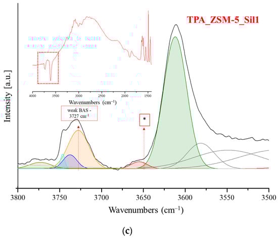 FTIR spectra of the activated P_ZSM-5 (a), H_ZSM-5_Sil1 (b), and TPA_ZSM-5_Sil1 (c) samples in the region 3900–3200 cm−1 with the respective deconvolution curves. Inset: Spectra presented in the range of 3600–3800 cm−1.