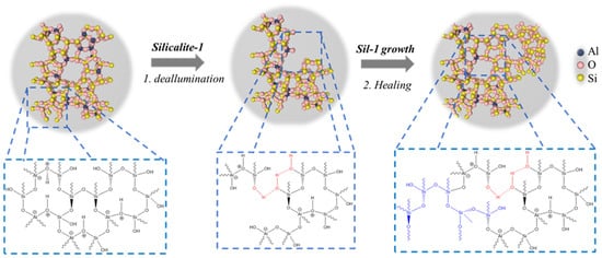 Schematic representation of the growth of Silicalite-1 on the parent P_ZSM-5 resulting in the formation of the composite with a lower amount of silanol defect sites.
