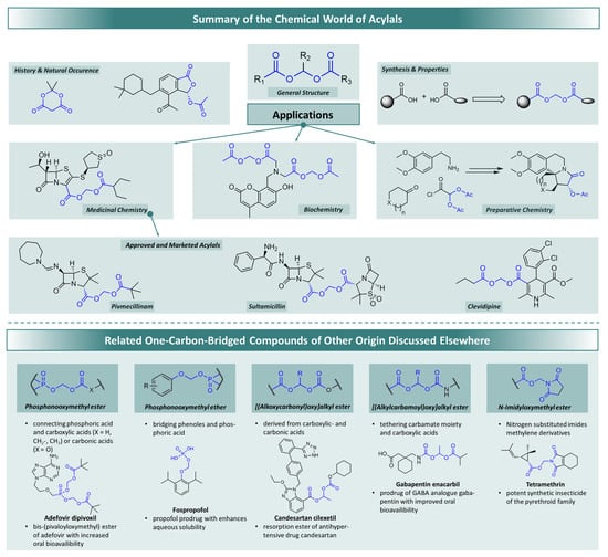Of particular importance in the field of such more demanding prodrug strategies are carboxylic diester compounds of geminal diols, or acylals for short. This structural motif offers the possibility of covalently and stably connecting two acidic substructures via a one-carbon bridge yielding either symmetrical acylals using identical carboxylic acid building blocks or asymmetrical acylals from two different carboxylic acids. The broad availability of non-toxic carboxylic acids thus renders acylals an interesting link to form asymmetrical acylals from drug molecules bearing a carboxy group and various carboxylic acids with great diversity. Figure 1 shows the basic chemical structure in the upper part of the overview. It can be seen that by changing the organic residues, countless compounds with an acylal structure are conceivable and thus a wide range of applications can be covered based on the properties of these compounds. For example, acylals are used in the prodrug research already mentioned—a sub-area of medicinal chemistry. Acylals can also be found in biochemical applications, where they play a particularly important role in imaging processes at the cellular level. On the other hand, certain acylals can be used in preparative chemistry, e.g., in the synthesis of more complex natural products.