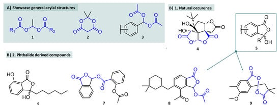 A schematic representation of acylals (A) and their natural occurrence (B1) as well as the substances derived from them (B2).