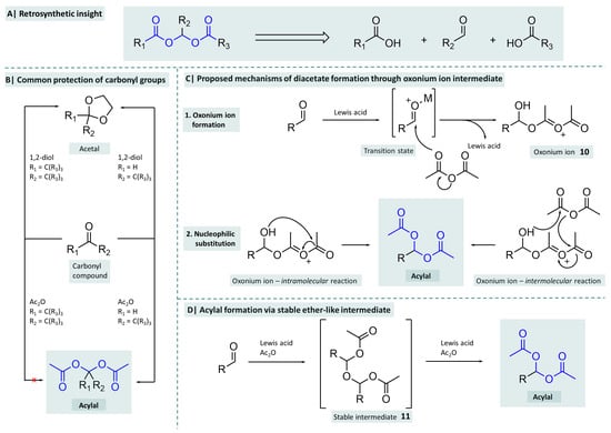 A retrosynthetic view of the chemical structure of acylals (Figure 3A) reveals that they are condensation products of two carboxylic acids with a hydrate of an aldehyde or ketone (=geminal diols). Due to the reactivity of these carbonyl functions, especially towards nucleophiles or, in the case of aldehydes, the tendency to become oxidised to carboxylic acids, a suitable protective group concept is necessary in the context of preparative chemistry. One of the most frequently used protecting groups for carbonyl functions are acetals (see Figure 3B).