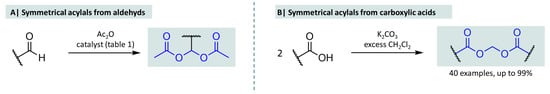 Possible synthetic routes towards symmetrical acylals. (A) Aldehydes as starting materials for the acylal synthesis. In this approach, the focus of the desired products lies on the substitution pattern of the aldehydes used. (B) Utilisation of dichloromethane as the donator of the bridging carbon atom. Here, the product is a methylene acylal with a variety of carboxylic acid motifs.
