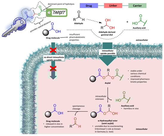 Good water solubility of drugs is often cited as a decisive factor for absorption and thus a prerequisite for efficacy [72]. However, good water solubility often goes hand in hand with reduced lipid/water partition coefficients, which has a negative effect on membrane permeation. In the case of carboxy group-containing molecules, their conversion to corresponding esters is a well-established prodrug strategy. This masking of polar groups is not limited to carboxylic acids, but has proven useful for phosphates, phosphonates, and sulfonates as well [73]. About 10% of all commercially available small molecule drugs are used in the form of prodrugs. And of these, almost 50% are converted into their active metabolites by enzymatic hydrolysis. Since hydrolytically active enzymes (hydrolases, EC class 3), including esterases, peptidases, and nucleases, are ubiquitous in the body, it is obvious to pursue prodrug strategies that utilise substrates of these enzymes. Countless alkyl and aryl esters have been clinically trialled and many have been successfully tested and developed to market maturity. Nevertheless, some ester prodrugs did not show the expected oral bioavailability, which is often due to slow or incomplete hydrolysis. It has been shown that this problem can be solved if a double ester prodrug strategy is pursued instead of simple esters. This method is also known as a pro-prodrug approach [3]. Here, the drug molecule is covalently bound to the linker-carrier construct. From a chemical point of view, it is a diester of an aldehyde hydrate (geminal diol), which means that theoretically both ester functions can be subjected to enzymatic hydrolysis in equal measure. Since the auxiliary acid usually has a small, sterically less demanding structure than the drug molecule, it is favoured for enzymatic hydrolysis. After this first saponification, the auxiliary acid and the less stable α-hydroxyalkyl ester of the drug remain, which spontaneously cleaves off the aldehyde and releases the drug molecule (Figure 6).