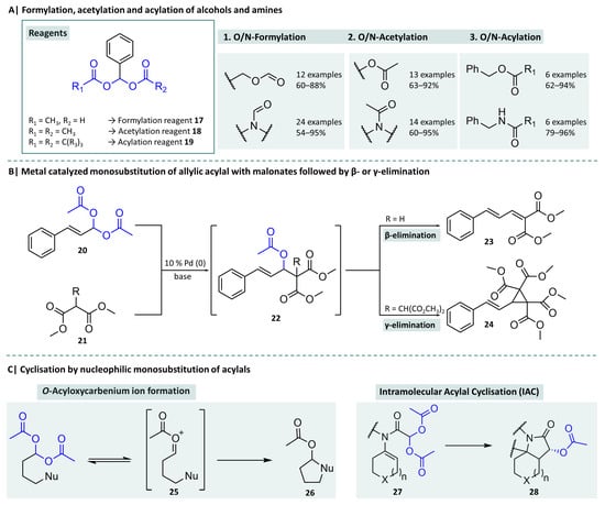 The total synthesis of complex natural substances based on simple molecules that are available at low cost has been the focus of many organic synthetic publications [76,77,78,79,80]. Irrespective of the natural product in question, these publications often contain reactions that form carbon-carbon bonds, build up larger rings and ring systems, require oxidations or reductions, derivatise heteroatom-containing partial structures in various ways, or, last but not least, focus on stereochemical considerations. Over the years of developing new synthesic methods, reagents and analytical methods, protecting group concepts and synthesis intermediates have played an important role in the targeted realisation of complex molecules. In this context, the class of acylals has also achieved a special status and several interesting applications for acylals, in particular, 1,1-diacetates, have been described. Acetylations are one of the most frequently occurring chemical reactions not only in the chemistry laboratory but also in living organisms, for example, as post-translational protein modification [81] and, in particular, histone acetylation as a pivotal process in cell cycle regulation [82]. The synthesis of formamides (formylation) is of great interest as they are precursors of many important functional groups, such as nitriles and isocyanides [83,84], or as reagents in important organic reactions, such as the Vilsmeier–Haack reaction [85]. Acetylation and formylation are mainly focused on primary and secondary alcohols and amines to form formates and acetates or formamides and acetamides, respectively. As early as 1941, Hurd, who also introduced the term “acylal” [86], and Green discovered that ethylidene diacetate, which had already been known for some time, reacts with aniline to form acetanilide [87]. They thus showed that the transfer of ester groups is possible with this regard. Certain acylal compounds have proven to be useful tools in this area. Chapman et al. were able to show that symmetrical and asymmetrical acylals are suitable as carriers of acetyl and formyl groups [88,89]. They used formyloxyacetoxyphenylmethane (Figure 7, compound 17) to insert the formyl group and benzylidene diacetate (18) to insert acetyl groups into alcohols and amines. They were able to demonstrate the robustness of their method by achieving good yields even under solvent-free conditions and generating esterification or amide formation even with larger coupling partners using reagents 19. However, the reagents used in their study were mainly symmetrical acylals, where, in theory, both ester groups can act as the particular acyl group. The authors were able to show that by utilisation of asymmetrical acylals (R1 ≠ R2) with a sterically demanding substituent (R1 = tert-butyl), a targeted transfer of the less sterically demanding ester can be achieved.