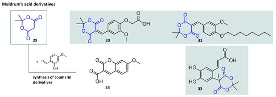 Among the acylal substances used in chemical synthesis, 2,2-dimethyl-1,3-dioxane-4,6-dione, better known as Meldrum’s acid, stands out. This cyclic compound can be understood as a condensation product of malonic acid and acetone and possesses a strong CH-acidity (Figure 8, compound 29) that exceeds that of the related malonic acid by orders of magnitude. This structural feature makes Meldrum’s acid a reactive compound with regard to a wide variety of reaction types, which have already been extensively summarised [23,100,101,102,103]. Meldrum’s acid and derivatives have proven to be particularly useful in the field of natural product synthesis, for example, as synthetic building blocks for terpene lactones, indole alkaloids, or tetramic acids. As Meldrum’s acid is subject to structural changes in all these approaches, the acylal structure is merely an intermediate. On the other hand, there are studies to characterise derivatives of Meldrum’s acid as pharmacologically active substances. For example, some Meldrum’s acid vanillidene compounds (30,31) show antimicrobial and antifungal properties [104]. A slight anti-cancer activity was also determined [105]. An antibacterial effect was also found for caffeic acid derivatives (32) with Meldrum’s acid moiety [106]. Meldrum’s acid is of synthetic interest as a starting material for the production of coumarin derivatives, secondary plant constituents that are used in a variety of applications, for example, in the perfume industry, but are also toxicologically relevant.