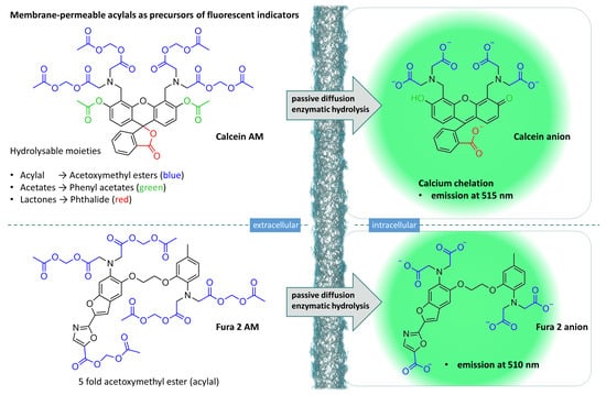 Building on this breakthrough discovery, a whole series of other substances were developed, many of which contain an acetoxymethyl structure. In most cases, this structure is bound to the carboxylic acids of the actual fluorescent dye (=“acylal”), in other substances to a phenolic hydroxy group (=“hemiacetal ester”) [109,110] or both; acylal and hemiacetal esters can be found in one molecule (e.g., Fluo 3 AM) [111].