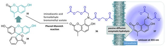 Structural relationship of fluorescein (34) and 4-methylumbilleferone (35), from which a synthetic approach afforded CalceinBlue AM (36) in a one-pot phenol-Mannich reaction. Similar to the above-mentioned compounds Calcein AM and Fura 2 AM, CalceinBlue AM permeates cell membranes followed by esterase-triggered hydrolysis.