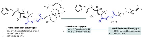 The molecular mechanisms that cause the development of resistance are diverse and can be caused by mutations in the penicillin-binding proteins (PBPs), the main targets of -lactam antibiotics, or by adaptation of the -lactamases leading to increased metabolisation of the antibiotics, as is the case with E. coli [124]. Biofilm formation [125], changes in metabolism [126], formation of efflux pumps [127], or simple overproduction of the addressed proteins also play an important role [128]. Most bacteria occur extracellularly, which simplifies their targeting with antibiotics. However, there are a number of intracellular pathogenic bacteria that pose significant problems worldwide [129]. They are difficult to address, as many antibiotics are characterised by poor intracellular diffusion. Attempts to overcome this problem have been made by Couvreur and co-workers. They developed nanoparticles (NPs) by covalently linking penicillin G with derivatives of squalene (Figure 11), a naturally occurring biocompatible lipid, once via an acetic acid linker with the corresponding alcohol (1,1′,2-trisnorsqualene alcohol) and as an acylal prodrug (38) by the reaction of the 1,1′,2-trisnorsqualene chloromethyl ester with penicillin G. Both constructs formed bioconjugates that spontaneously formed stable nanoparticles, and the acylal was shown to be transported into cells by endocytotic processes, including clathrin-dependent endocytosis, where it rapidly and extensively killed the bacteria [130]. However, the use of this bioconjugate was associated with increased cell toxicity, possibly due to the release of squalenic acid, which is highly surface-active and can have a damaging effect on the integrity of the cell. Building on their previous results, they developed further penicillin bioconjugates, for example, with geraniol (39) and farnesol (40), both polyisoprenes with shorter chain lengths, in the hope of combining consistent transport properties with reduced cell toxicity. While the corresponding farnesol acylal continued to show cell toxicity, the geraniol acylal was able to reduce the number of intracellular bacteria by 99.9% and at the same time showed less cell toxicity. This dramatic improvement in this case also shows the superiority of the acylal diester structure over simple carboxylic acid esters, which were also investigated in this study and did not show sufficient hydrolysis, which was reflected by low levels of free penicillin G and, ultimately, a significantly lower antibiotic effect observed (see Figure 11) [131]. The authors recently published a comprehensive overview of self-assembled lipid-prodrug nanoparticles [132].