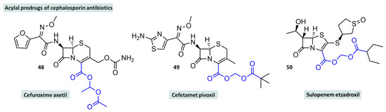 The initial, quite understandable, euphoria that accompanied the introduction of penicillins was dampened shortly afterwards, as many patients were no longer responding to the adequate antibiotic treatment due to the emergence of resistance. This led to further developments of -lactam antibiotics, which culminated in the discovery of cephalosporins, whose basic structure is also of natural origin and whose potency and spectrum of action was improved by partial synthetic changes and which usually exhibit increased metabolic stability [145]. However, the structural similarity to penicillins explains that the pharmacokinetic parameters are similar, so that improved oral bioavailability could not be observed on a sufficient scale. Therefore, appropriate prodrugs are required for sufficient efficacy after oral administration [146,147]. One of the most commonly prescribed cephalosporins and antibiotics in general is cefuroxime. It is used for acute and chronic infections of the respiratory tract as well as the skin and kidneys. It also enters the cerebrospinal fluid—a unique feature among cephalosporins—which makes it possible to treat menigitis with cefuroxime. Cefuroxime is not administered as a free acid. For intravenous administration, the corresponding sodium salt is used, which is highly soluble in water but has little effect when administered orally. Cefuroxime is, therefore, used for oral administration in the form of its resoprtion ester cefuroxime axetil (Figure 14, 48), an example of an ethylene acylal. The additional methyl group on the bridging carbon atom creates an additional stereocentre, so that cefuroxime axetil is a mixture of diastereomers. This is also used therapeutically as such, as the ester structure has no influence on the pharmacological interaction with the target biomolecule, as it is hydrolysed beforehand. The oral bioavailability of cefuroxime axetil is around 70% [148]. Another example of an acylal prodrug of cephalosporins is cefetamet pivoxil (49), a methylene acylal with pivalic acid [149]. Recent developments in the field of carbapenems show that this substance class, which is usually not perorally bioavailable, has sufficiently high oral bioavailability in the form of acylal prodrugs. Examples of this are sulopenem etzadroxil (50) and tebipenem pivoxil. Sulopenem is bound to 2-ethylbutanoic acid via a methylene bridge and is currently under review by the FDA for approval for the treatment of uncomplicated urinary tract infections. It is intended to be used in combination with probenecid, which reduces renal clearance and increases plasma levels by inhibiting the organic anion transporter type 1 (OAT1) [150,151]. Cefpodoxime proxetil is a double ester as well but represents a non-classical acylal derived from ethyl carbonate [152].
