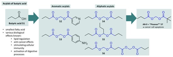 In addition to -lactam antibiotics, which probably represent the largest class of substances that have been extensively subjected to acylal prodrug strategies, such derivatisations can be found in many other drug classes. The obvious reason for this is the presence of many structural motifs of natural origin in drugs which, despite good efficacy at the biological target, exhibit some pharmacokinetic deficits or are metabolised before therapeutic blood levels are reached. For example, it is known from individual studies that the naturally occurring and very simple butyric acid (see Figure 15, 51) has an inhibitory effect on certain histone deacetylases (HDACs), which are associated with a number of pathological changes, e.g., the development of cancer [153]. However, the treatment of cancer with the administration of pure butyric acid does not lead to the desired effects and would also be limited due to the unpleasant odor. The rapid metabolisation of butyric acid does not allow therapeutic doses to be administered to the site of the biological target molecule, so studies on prodrugs were carried out. Some of these prodrugs, which are to be understood as butyric acid acylals with various other small carboxylic acids, are shown in Figure 15. The best properties in terms of efficacy and pharmacokinetics are shown by AN-9 (“Pivanex”)—the methylene acylal of butyric acid and pivalic acid (57). This prodrug has a 100-fold faster effect on cancer cells at a 10-fold lower concentration than pure butyric acid [154,155]. In its capacity as a histone deacetylase inhibitor, AN-9 has also shown efficacy in phase II studies in non-small cell lung cancer (NSCLC), where it was also very well tolerated [156,157]. In further studies (phase IIb), the efficacy in combination with the cytostatic drug docetaxel was investigated and despite initial good results, clinical testing of AN-9 was discontinued by the manufacturer in 2004 due to safety concerns [158]. Nevertheless, many advantages of butyric acids and related butyrates and butyrins (triesters of glycerol) are known and were summarised recently by Gerunova et al. [159].