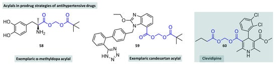 Hirschmann and colleagues synthesised a series of derivatives of -methyldopa, an antihypertensive drug structurally derived from dopamine and a methylated derivative of l-dopa. It is mainly used in the treatment of high blood pressure in pregnant women [160]. As a hydrophilic amino acid, methyldopa shows only limited resorption from the gastrointestinal tract. Various ester and acylal prodrugs (Figure 16, compound 58) were presented, whereby it was shown that the pivaloyloxyethyl acylal was able to lower blood pressure in the animal model (SH rats) three times more potently than methyldopa [161]. In the treatment of high blood pressure, AT1 antagonists (“sartans”) are among the drugs of choice, alongside ACE inhibitors. They can also be used to treat cardiac insufficiency or diabetic nephropathy. Candesartan is a well-known representative of this drug class. Since the free acid candesartan has poor membrane permeability, the drug is administered as a prodrug. The blockbuster drug here is candesartan cilexetil—an acylal-type prodrug in which candesartan is combined with a carbonic acid esterified with cyclohexanol via an acetaldehyde linker. In addition to this prodrug, which ultimately reached market maturity, classical acylals were also investigated which showed similar pharmacokinetic behaviour [162]. Another classic acylal prodrug with marketing authorisation is clevidipine (60), a substance from the class of calcium channel blockers of the dihydropyridine type (Figure 16). Substances of this type have in common that they carry two carboxylic acid functions in positions 3 and 5 on the eponymous 1,4-dihydropyridine base body, the different esterification of which results in a diversity of substance class representatives. Clevidipine is a methyl ester (position 3) and a butanoyloxymethyl ester in position 5. It is only used intravenously to treat high blood pressure in perioperative situations. The reduction is very rapid and the half-life of the substance is only about one minute [163,164].