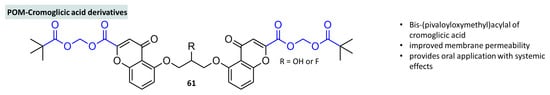 If absorption via the gastrointestinal tract is not sufficiently possible due to the chemical composition, the use of such a drug is limited either to parenteral application if systemic effects are desired, or to local application. Cromoglicic acid and the related nedocromil, both belonging to the chromone group of substances, which includes the plant constituents flavone and isoflavone as well as the cardioactive substances khellinin and khellin, are used locally to treat acute allergic events and to prevent them. The positive consequence of local application is that systemic side effects are almost completely avoided and the substances are, therefore, well tolerated. Nevertheless, some unexpected effects have been described with systemic application. For example, an inhibitory effect on -amyloid aggregation and increased microglial uptake and clearance have been observed for cromoglicic acid. Its use in the treatment of Alzheimer’s disease is, therefore, currently the subject of research. Diacylals were presented to increase the membrane permeability of cromoglicic acid and derivatives [165] (Figure 17, 61).