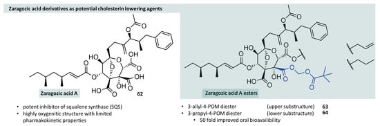 Certain ingredients from plants, animals, or fungi can modulate the activity of various enzymes due to their structural similarity to natural substrates. For example, it was found that saragossic acids isolated from the fungi Leptodontidium trabinellum and Sporomiella species can inhibit squalene synthase (SQS) in the picomolar range [166]. Since squalene synthase catalyzes a key step in the mammalian mevalonate pathway, at the end of which isopentenyl pyrophosphate and dimethylallyl pyrophosphate are the starting materials for human cholesterol biosynthesis, the inhibition of SQS is an interesting target for pharmacological intervention in cases of high cholesterol levels. The in vitro studies on rat liver squalene synthase showed high potency of zaragozic acids (Figure 18, 62), but in vivo (in mouse and rat) only minor effects could be seen, which was attributed to insufficient oral bioavailability.