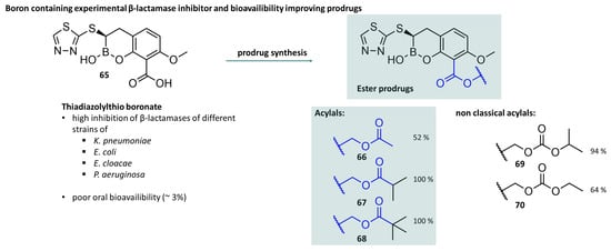 Minor modifications to the molecule, mainly involving esterification, resulted in improved oral bioavailability. In particular, pivaloyloxymethyl esters (63,64) at position 4 were shown to be a useful derivatisation, which, in combination with simple esterification of the carboxylic acid at position 3, resulted in a 50-fold improvement in oral bioavailability compared to the parent acid [167] (Figure 18). Acylal-prodrug strategies are still part of the iterative synthesis of novel drugs commonly used in medicinal chemistry with the aim of positively modelling pharmacokinetics in addition to efficacy at the biological target. Hecker et al. synthesised a series of cyclic boronic acids with inhibitory activity on serine and metallo -lactamases that can open up new treatment options in combination with known beta-lactam antibiotics (Figure 19, compound 65). However, as already known for other beta-lactamase inhibitors, these compounds showed poor oral bioavailability. By esterification of the carboxylic acid to acylals (66–68), the bioavailability could be increased from about 3% to 100% in rat experiments when sterically demanding carboxylic acids were used. The authors also investigated non-classical acylals (69,70), namely, derivatives of carbonic acid, and were also able to determine a significantly increased, but not 100%, bioavailability [168].