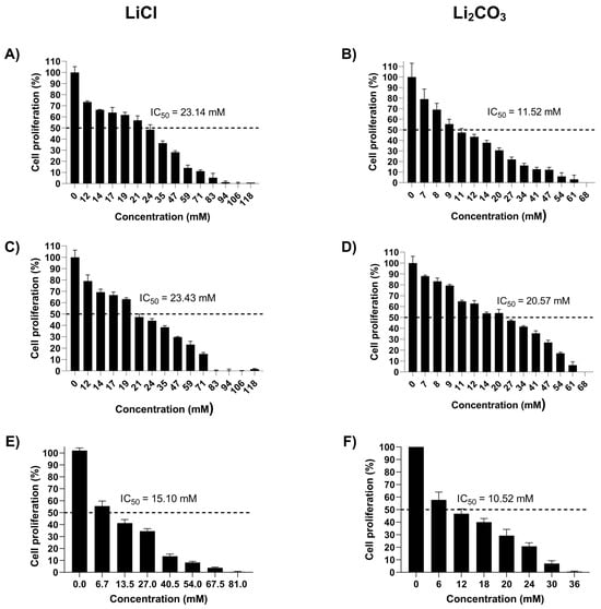 Thus, the cell proliferation percentage at 24 h of exposure to several LiCl and Li2CO3 concentrations was obtained (Figure 1). Both lithium salts induce cell proliferation in a concentration-dependent manner in HeLa (Figure 1A,B), SiHa (Figure 1C,D), and HaCaT (Figure 1E,F) cells. Table 1 shows the IC50 values that depend on the genotype of cells and the lithium salts. The IC50 values calculated for LiCl are in the same range for SiHa and HeLa cell lines. In contrast, for HeLa cells, the IC50 values for Li2CO3 are different, and the IC50 from SiHa is 1.79-fold higher than that of HeLa cells. For the non-tumorigenic cell line (HaCaT) the IC50 values were lower than tumorigenic cell lines. Considering these data, the IC50 values were selected for further analysis.