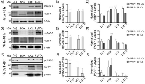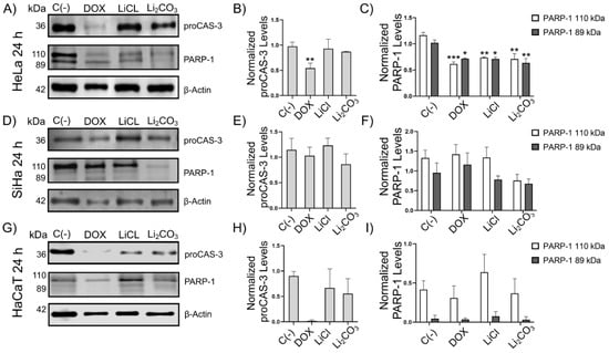 Effect of lithium salts over the expression of apoptotic biomarker proteins at 24 h of stimuli. Western Blot analysis to detect PARP-1 in HeLa (Panels A–C), SiHa (Panels D–F), and HaCaT (Panels G–I) cells untreated [C(-)] or after 24 h of LiCl or Li2CO3 treatments. PARP-1 was also detected in cells treated with Dox. Two bands corresponding to full-length PARP-1 (110 kDa) and cleaved isoform (89 kDa) were detected in the samples. β-actin was detected as a loading control. All experiments were assessed in triplicate and the values are expressed as the mean ± SD with a (* p < 0.05, ** p < 0.002, *** p < 0.001). β-actin was used as a loading control in all samples.