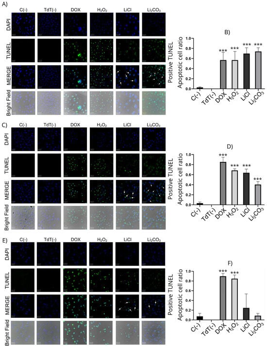 Fluorescent TUNEL labeling of lithium-treated HeLa cells (panels A,B), SiHa (panels C,D), and HaCaT (panels E,F). Cells were treated with LiCl or Li2CO3 for 24 h before TUNEL labeling—images for TUNEL staining overlay green fluorescence from the TUNEL stain with blue fluorescent from DAPI. Positive apoptotic cells exhibit the characteristic fragmented nuclei (arrows). More apoptotic cells appeared in the presence of Li2CO3. Untreated cells [C(-)] or cells tested in the absence of TdT enzyme [TdT(-)] or cells treated with Dox or H2O2 were included as controls. Magnification ×400, scale bar represents 40 µm. We observed a statistically significant difference between LiCl and Li2CO3 treatments. All experiments were assessed in triplicate, and the values are expressed as the Mean ± SD with *** p < 0.001.