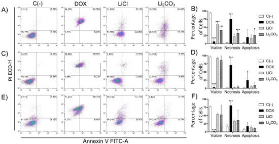 Quantification of cell apoptosis by flow cytometry on HeLa cells (panels A,B), SiHa cells (panels C,D), and HaCaT (panels E,F). The upper left quadrant means Annexin V-negative, PI-positive (Annexin V−, PI+) cells, defined as necrotic cells. The upper right quadrant means Annexin V-positive, PI-positive (Annexin V+, PI+) cells, defined as late apoptotic cells. The lower left quadrant means Annexin V-negative, PI-negative (Annexin V−, PI−) cells, which are defined as viable cells. The lower right quadrant means Annexin V-positive, PI-negative (Annexin V+, PI−) cells, which are defined as early apoptotic cells. Panels (B,D,F) are shown in the statistical analysis when comparing the lithium-treated with the control groups. All experiments were assessed in triplicate, and the values are expressed as the mean ± SD with * p < 0.033 and *** p < 0.001.