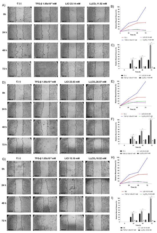 Cell migration of SiHa, HeLa, and HaCaT cell lines was significantly enhanced after TGF-β treatment (positive control) compared to untreated cells [negative control, C(-)]. Conversely, in Hela (Figure 7, Panels A–C), SiHa (Figure 7, Panels D–F), and HaCaT (Figure 7, Panels G–I) cells, the presence of lithium salts significantly reduced cell migration evaluated at 24, 48, and 72 h (** p > 0.001). In SiHa cells, the relative migration was 16.52% at 24 h and 13.34% at 48–72 h after LiCl treatment, while for Li2CO3 treatment, the relative migration was 10.51% at 24 h to 18.29% at 48–72 h. In HeLa cells, relative migration was 6.44% for 24, 48, and 72 h after LiCl treatment and 5.75%, 8.58%, and 5% for 24, 48, and 72 h after Li2CO3 treatment, respectively. In HaCaT cells, relative migration was 6.21% for 24, 48, and 72 h after LiCl treatment, and for Li2CO3 treatment, the relative migration was 5.73%, 6.54%, and 3.4% for 24, 48, and 72 h, respectively. In negative controls [C(-)] for SiHa, HeLa, and HaCaT cells, the relative migration was 20.51% for 24 h and 35.02% for 48–72 h, while in positive controls (TGF-β), the relative migration was 28.95–34.5% for 24 h, 42.31–52.31% for 48 h and 97–98% for 72 h.