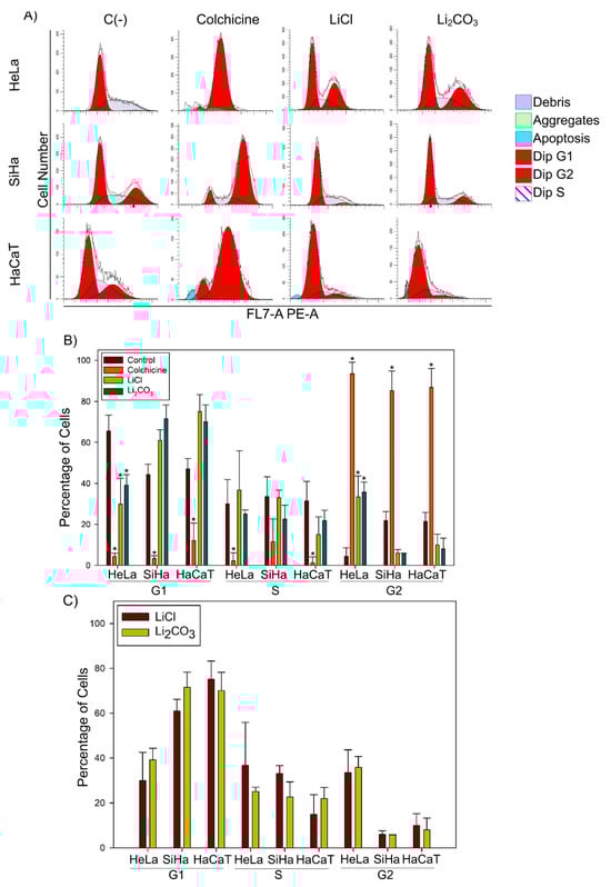 An ANOVA analysis of cells at the G1 and G2 phase showed that LiCl or Li2CO3 treatments had a statistically significant difference with control (untreated cells) and with cells treated with colchicine (positive control) (p < 0.05) (Figure 8, panel B). For HeLa cells, we found a statistically significant difference between cells in the G1 phase after LiCl or Li2CO3 treatment compared to untreated SiHa cells, suggesting that LiCl or Li2CO3 treatment inhibited the progression of the cell cycle at the G1 phase. According to statistical analysis by one-way ANOVA, we found a statistically significant difference between cells in the G1 phase after LiCl or Li2CO3 treatment compared to colchicine-treated SiHa cells. No statistical differences were observed for cells accumulating in the S phase in SiHa or HeLa cell lines. Evidence from the HeLa cell line suggested that LiCl arrested the cell cycle at the S phase, whereas Li2CO3 arrested the cell cycle at the G1 phase. On the other hand, SiHa cells treated with LiCl or Li2CO3 arrested the cell cycle at the G1 phase. The non-tumoral cell line (HaCaT) cell cycle was arrested at the G1 phase after LiCl or Li2CO3 treatments.