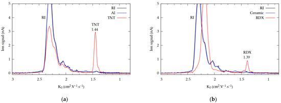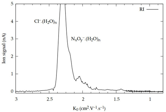 An IMS instrument equipped with a CD ionization source was operated in the reverse gas flow mode at 60 °C. Purified air was used as the drift gas, and the addition of a small admixture of dopant gas C2Cl6 resulted in the formation of a dominant reactant ion (RI) peak for Cl−∙(H2O)n (n = 0, 1, 2, 3, …) with a reduced ion mobility value (K0) of 2.30 cm2·V−1·s−1, as well as an auxiliary peak for NxOy−∙(H2O)n (the bulk on the right side) [14,39,43], as shown in Figure 1. The negative ions and their water clusters appear in the IMS spectrum as a single peak (RI) due to the equilibrium between cluster formation and the dissociation of clusters in the IMS drift tube [43]. The purpose of the dopant gas is to enhance the sensitivity and selectivity of the instrument for explosive detection [25,50].
