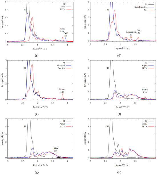 Sample of selected IMS spectra of explosives from different surface materials. (a) TNT from aluminum; (b) RDX from ceramic; (c) PETN from PVC; (d) C-4 from stainless steel; (e) Semtex from drywall; (f) PETN from paper; (g) RDX from paper; and (h) PETN from wood. The surface concentrations were not calculated.