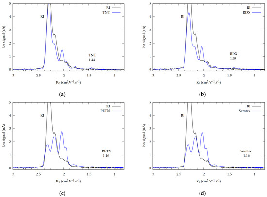 In addition to TNT, we carried out studies of isomers of DNTs. Characteristic peaks were detected for each isomer (1.55 for 2,4-DNT, 1.52 for 3,4-DNT, and 1.46 cm2·V−1·s−1 for 2,6-DNT; please see Figures S6–S8 in each section of the Supplementary Materials). In the case of 3,4-DNT, three specific peaks were observed. One of them was formed via reaction 2 (K0 = 1.52 cm2·V−1·s−1), and the other two peaks with reduced ion mobility of 1.42 and 1.34 cm2·V−1·s−1 were apparently created by ionization with NxOy [51]. Please see the Supplementary Materials for the full set of IMS spectra of DNT isomers.