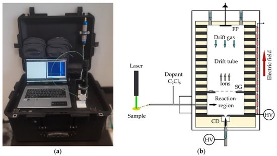 (a) Storage of the IMS instrument in a transport box with electronics, battery, flow system, and laser; (b) scheme of IMS with dopant gas C2Cl6 and laser.