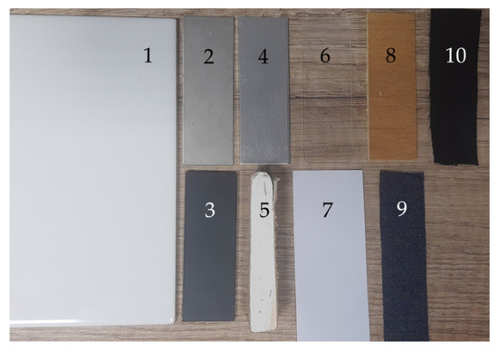 Image of various surfaces used in this study: 1—ceramic; 2—stainless steel; 3—PVC; 4—aluminum; 5—drywall; 6—glass; 7—paper; 8—wood; 9—denim; 10—cotton.