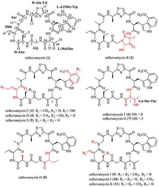 Natural products are an exceptional source of inspiration in drug discovery and frequently serve as valuable starting points in chemical probe synthesis [1,2]. Zelkovamycin (1, Figure 1) is a cyclic octapeptide consisting of glycine (Gly), 2-amino butyric acid (Abu), (Z)-dehydrobutyric acid (Z-Dhb), sarcosine (Sar), alanine–thiazole amino acid (Ala-Thz), 4-methoxy tryptophan (4-MeO-Trp), and 2-methyl-3-oxobutyrine (MeObu) amino acids (for unprecedented amino acids in a peptide natural product). It was discovered by the Ōmura research group in 1999 from Streptomyces sp. K96-0670 [3,4]. The stereochemistry of the different amino acids in zelkovamycin, however, was not reported in the original report. In 2021, Chan et al. found Actinomadura graeca sp. as a novel producer of zelkovamycin [5]. Gan et al. identified 10 other zelkovamycin congeners from the culture of endophytic Kitasatospora sp. CPCC 204717, named zelkovamycins B–K (2–11, Figure 1) [6,7]. From these cyclopeptides, zelkovamycin B was featured by an unprecedented 3-methyl-5-hydroxypyrrolidine-2,4-dione ring system linked to the cyclopeptide skeleton. Zelkovamycins F and G (6 and 7) possess unprecedented nonproteinogenic amino acid residues, namely L-α-methylthreonine and L-α-methyl-allo-threonine, respectively. These represent the first example of natural peptide products that contain the Cα-methyl-threonine monomer. Compared to the structure of other zelkovamycins, zelkovamycin H (8) was the only congener lacking the oxy group at C-34 and the α-methyl group at C-32. The incorporation of the Abu residue by replacing the MeObu unit in zelkovamycin H might be due to the low selectivity of the A domain in module 8 for biosynthetic gene cluster of zelkovamycins from Kitasatospora sp. CPCC 204717 [6].