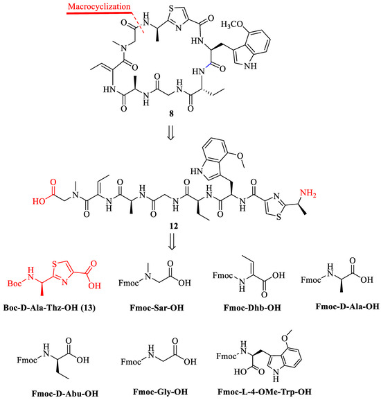 The retrosynthetic analysis of zelkovamycin H (8) is shown in Figure 2. Heptapeptide 12 can be obtained by cleaving the amide bond between Sar and Ala-Tzl residues. This heptapeptide can be assembled by the following amino acids: Fmoc-Sar-OH, Fmoc-Dhb-OH, Fmoc-D-Ala-OH, Fmoc-Gly-OH, Fmoc-D-Abu-OH, Fmoc-L-4-OMe-Trp-OH, and Boc-D-Ala-Thz-OH. All these amino acids are commercially available, except for Boc-D-Ala-Thz-OH, which is a thiazole-containing amino acid.