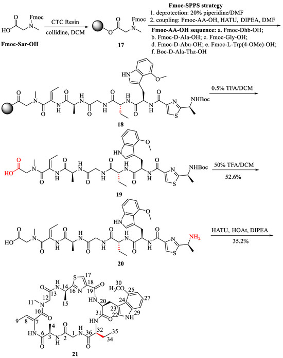 The deprotection of the Fmoc group and coupling steps were repeated, sequentially coupling the remaining amino acids to the resin in the following order: Fmoc-D-Ala-OH, Fmoc-Gly-OH, Fmoc-D-Abu-OH, Fmoc-L-Trp(4-OMe)-OH, and Boc-D-Ala-Thz-OH. Then, 18 was obtained.