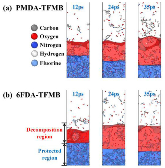 Figure 1 illustrates the structural changes that take place during AO erosion. The region eroded and penetrated by AO is called the decomposition region, while the underlying polymer that AO has not yet reached is the protected region. High-energy AO erosion causes damage in both models, with numerous small molecular fragments escaping from the polymer surface. These fragments may reattach after repeated AO impacts, which may slow further AO erosion, acting as a self-sacrificial defense mechanism. The interface between the decomposition and protected regions continues to recede, expanding the decomposition region. Significant loosening and cracking are observed in the PMDA-TFMB polymer base, attributed to the high reactivity of AO, which reacts with fluorinated polyimides and injects heat into the polymer, causing loosening and cracking as temperatures reach pyrolysis thresholds.
