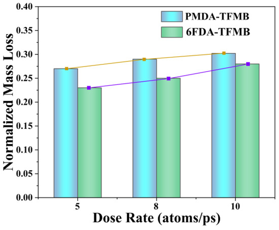To quantitatively assess the erosion resistance of the models, the normalized mass loss of the polymer models under various AO doses was calculated. The normalized mass loss, determined by dividing the lost mass by the initial mass, is shown in Figure 2. Across all erosion doses, 6FDA-TFMB exhibits lower mass loss compared to PMDA-TFMB, which can be attributed to the high bond energy of C-F bonds due to fluorine’s strong electronegativity, with more -CF3 groups enhancing chemical stability. As AO doses increase, mass loss shows a convergent trend due to increased collision probabilities between AO and small fragments, causing escaped fragments to repeatedly detach and reattach to the polymer surface.