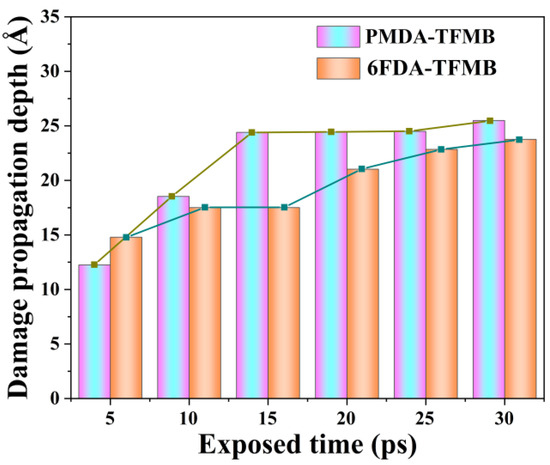 Figure 3 shows the maximum damage propagation depth during AO erosion simulations. As the reaction progresses, the damage propagation depth of both models increases. During initial AO erosion (first 15 ps), the PMDA-TFMB model shows nearly linear damage propagation, with the polymer undergoing rapid decomposition, reaching maximum damage depth around 15 ps before stabilizing, indicating peak decomposition rates. In contrast, 6FDA-TFMB shows three stages of damage propagation: an initial increase due to AO impact (0–10 ps), a stable phase (10–15 ps), and further increases (25–30 ps) as rising temperatures make the sparse polymer more susceptible to AO penetration, extending damage depth.