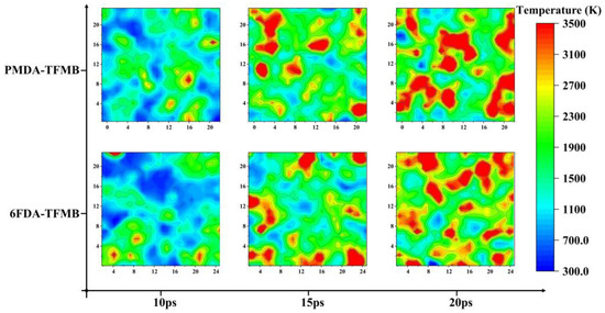 Further analysis calculated local temperatures near Z = 20 Å at 10 ps, 15 ps, and 20 ps of AO erosion for both models, shown in Figure 5. In early stages (first 10 ps), temperature distributions show no significant differences. By 15 ps, both models develop local hotspots, with AO transferring heat to these regions, and 6FDA-TFMB showing slightly more hotspots due to earlier fragment escape from PMDA-TFMB, causing temporary cooling. At 20 ps, PMDA-TFMB exhibits more concentrated hotspots, with nearby polymers undergoing significant pyrolysis and heat dispersion.