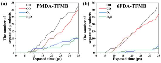 During AO erosion simulations, types and quantities of small molecular substances separated from the polymer surface above 10 Å were recorded every 1 ps, shown in Figure 6. Primary products include OH, CO, O2, and H2O. Before 5 ps, no small molecule escape is detected, as AO energy injection has not reached polymer degradation thresholds. As AO erosion continues, OH and CO quantities rise sharply. In reactions between AO and polyimides, OH forms from dehydrogenation reactions between AO and polymers, while CO results from the decomposition of benzene and imide rings. O2 forms from AO recombination and collisions with carbonyl groups in imide rings, and H2O forms from continuous AO dehydrogenation and collisions between OH and free hydrogen atoms. OH is the most abundant product, followed by CO, making them primary erosion products. 6FDA-TFMB shows slightly lower O2 and H2O quantities due to the presence of more -CF3 groups near imide rings. The strong electron-withdrawing effect of -CF3 reduces the electron density of C=O and C-N bonds, making these groups less susceptible to oxidation [35]. Additionally, steric hindrance from -CF3 groups prevents AO from attacking C=O bonds, reducing reaction likelihood with AO [36].