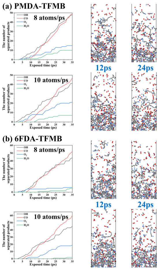 To study the impact of different AO erosion concentrations on by-product quantities, PMDA-TFMB and 6FDA-TFMB models were analyzed under AO injection frequencies of 8 atoms/ps and 10 atoms/ps, as shown in Figure 7. Increasing injection frequency raises small molecule product counts, with CO exceeding OH and becoming the primary product. Extensive polymer degradation is observed, with polyimide molecules escaping as carbon chains, and bottom polyimides becoming loose, with simultaneous AO impact and polymer pyrolysis leading to rapid degradation.